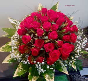 Romantico bouquet di rose rosse e gipsophila con verde decorativo Si può richiedere con 12 – 18 – 24 – 30 rose. Per un numero diverso di rose contattarci.