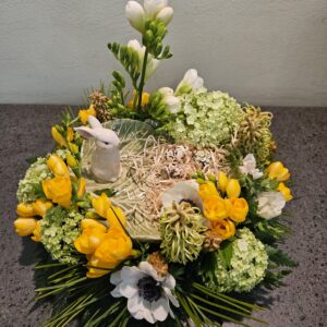 Centrotavola Pasquale con piatto e coniglietto in ceramica con fiori primavera: fresia, tulipani, ranuncoli, anemoni …