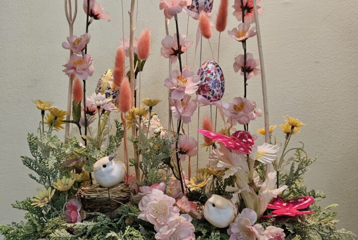 Centrotavola Pasquale con ciotola e coniglietto in ceramica e fiori primavera