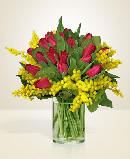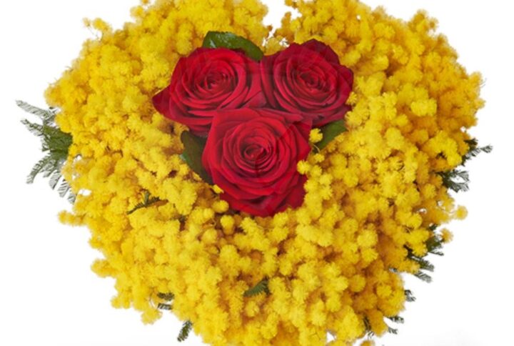 Fascio di rose rosse a stelo medio (50/55 cm) e mimosa disponibile con 3 rose + mimosa oppure con 12 rose + mimosa oppure con 24 rose + mimosa. Per fasci con un n. di rose differente contattarci telefonicamente. E’ possibile abbinare un vaso in vetro. Disponibile da gennaio a marzo