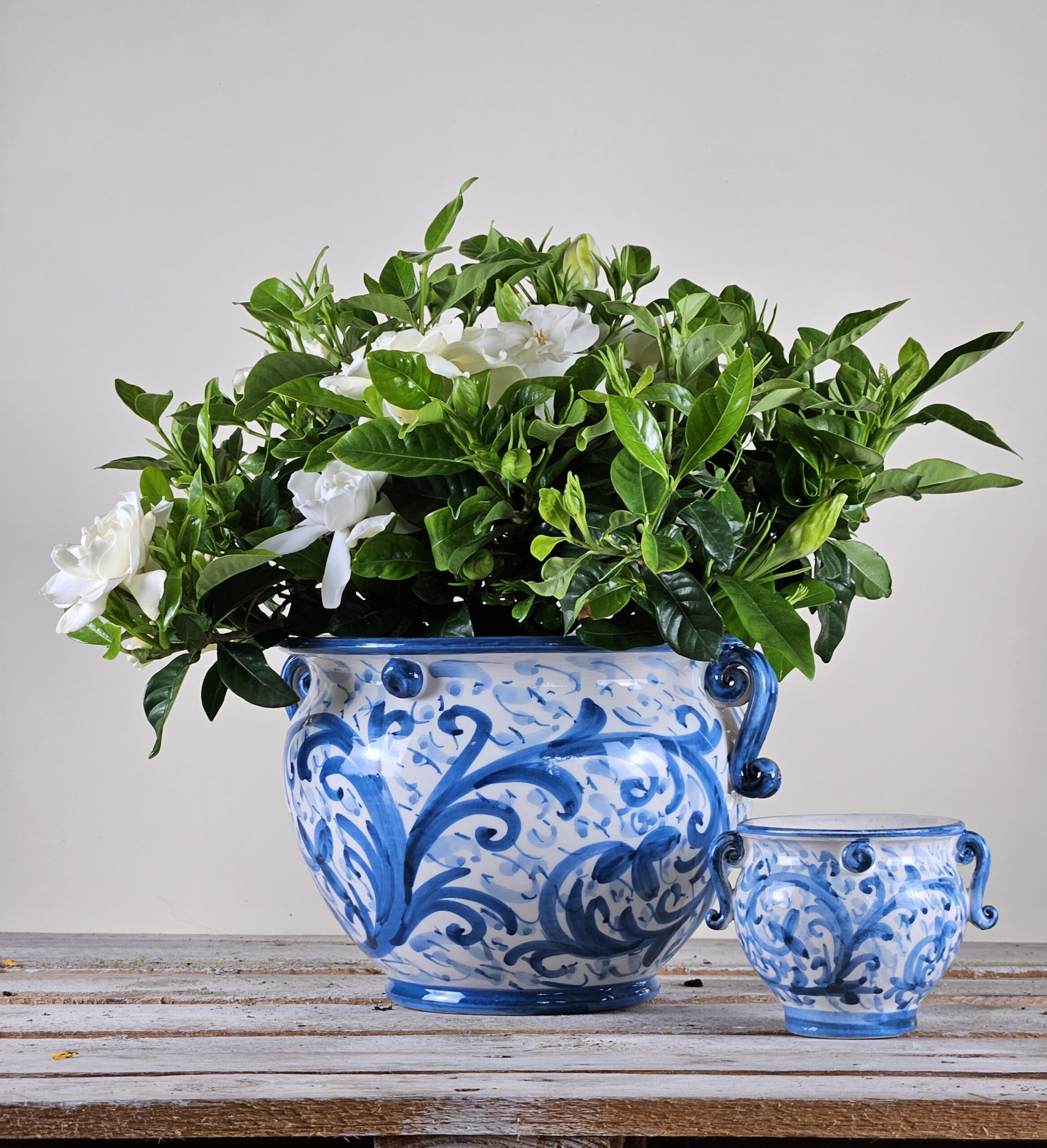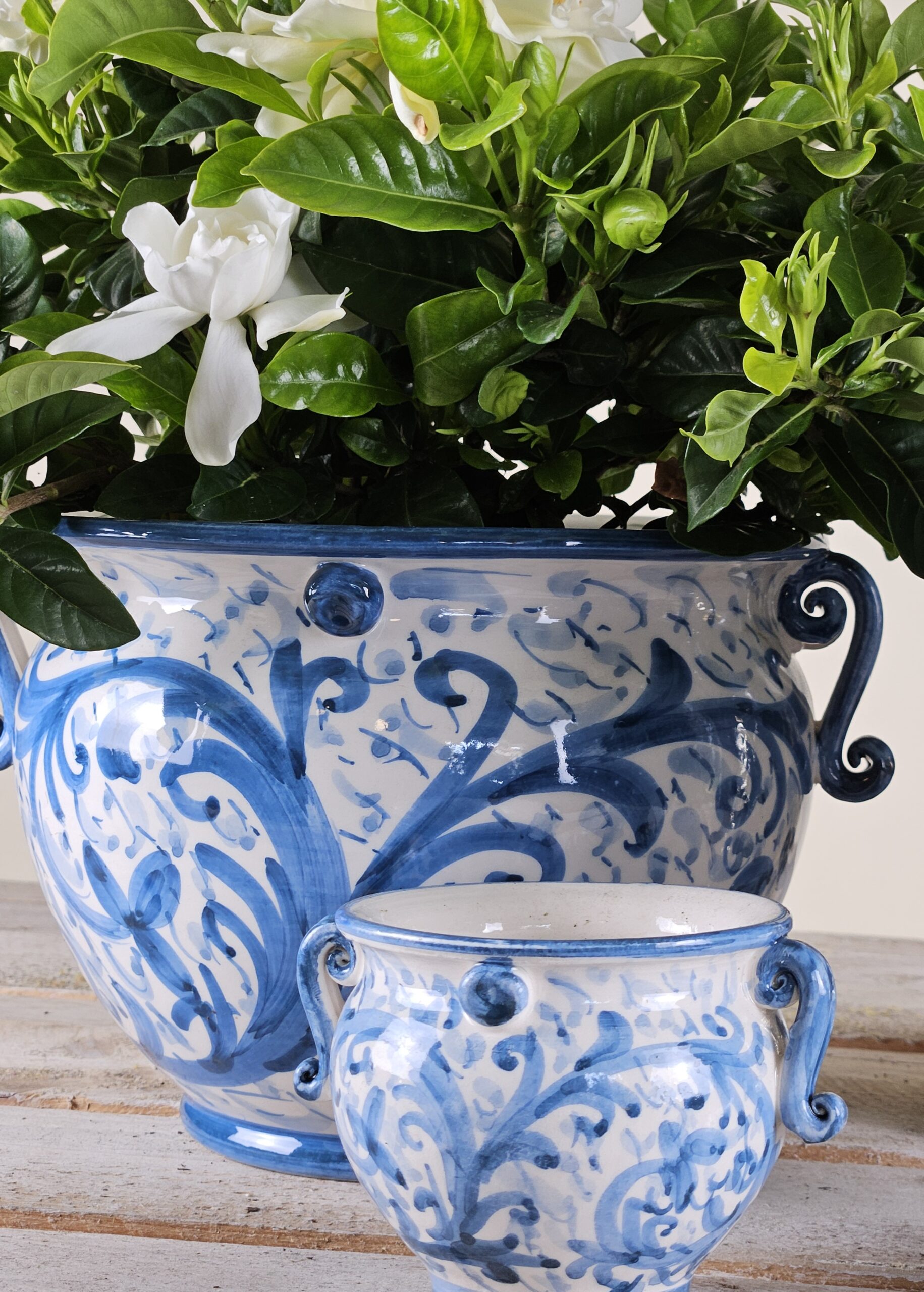 Pianta di azalea o di gardenia in vaso ceramica di Caltagirone disponibile in 2 dimensioni: diametro del vaso 12 e 16 cm, il colore del vaso può essere bianco e blu (come in foto), bianco e avorio, bianco e nero o bianco e verde; al momento dell’ordine, nelle note informative, specificare il colore del vaso in caso di preferenza.